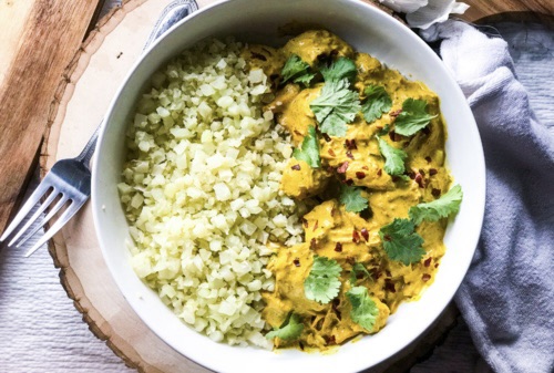 Chicken Coconut Curry with Fried Okra and Cauliflower Rice